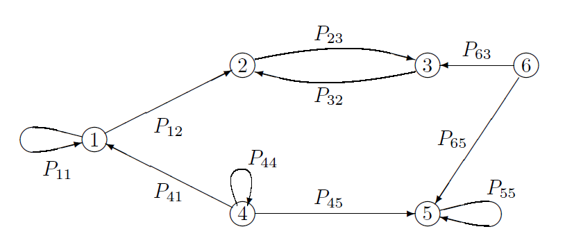 Como primeiro passo no estudo, vamos determinar por inspeção quais estados se comunicam com quais outros. Isto pode ser realizado indicando a matriz da seguinte forma: \begin{equation} \mathcal{P} \, = \, \begin{pmatrix} + & 0 & 0 & 0 & 0 & 0 \\ + & + & + & + & + & + \\ + & + & + & + & + & + \\ 0 & 0 & 0 & + & + & + \\ 0 & 0 & 0 & + & + & + \\ 0 & 0 & 0 & + & + & + \end{pmatrix}\cdot \end{equation}