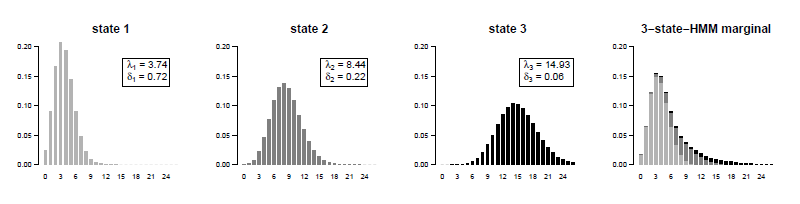 Figura V.2: Distribuições de estado dependentes componentes do modelo HMM Poisson com \(m=3\) estados nos três primeiros gráficos, de esquerda para direita. Último gráfico mostrando as distribuições marginais. Dados da série de vendas de sabão.