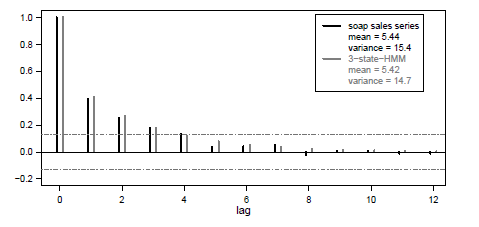 Também é interessante considerar a função de autocorrelação do modelo HMM Poisson de três estados selecionado. As autocorrelações podem ser avaliadas usando a fórmula dada na Seção II.2. Na Figura V.3, a função de autocorrelação do modelo ajustado é justaposta à função de autocorrelação amostral. É óbvio que ambas as funções de autocorrelação correspondem em grande parte. Além disso, os momentos marginais do HMM, que também são apresentados na Figura V.3, estão próximos dos momentos empíricos das observações. No entanto, é possível aplicar métodos mais sofisticados para o diagnóstico do modelo, conforme será mostrado na seção a seguir.