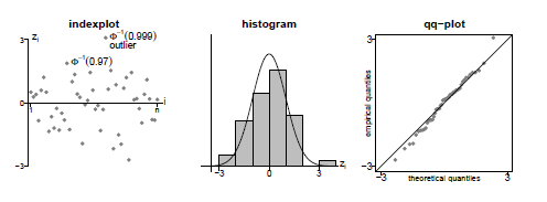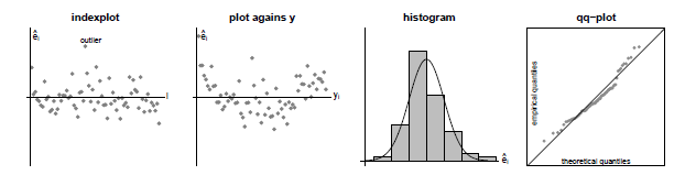 Por exemplo, para procurar outliers ou verificar estruturas e dependência específicas, pode-se desenhar um gráfico do índice dos resíduos ou plotá-los na variável dependente ou covariáveis. Caso certos padrões ocorram, o modelo deve ser revisado e melhorado, por exemplo, adicionando termos quadráticos ou cúbicos ou mesmo novas covariáveis. Outra possibilidade é testar as premissas distribucionais usando histogramas ou gráficos qq dos resíduos. Algumas dessas parcelas residuais são ilustradas na Figura V.4.
