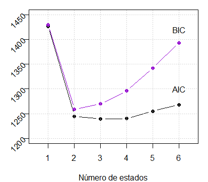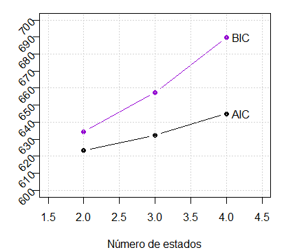Percebemos claramente que os resíduos mostram-se similares conforme o número de estados. Significa que desta maneira não podemos decidir qual destes modelos escolher. Mostramos a seguir o comportamento dos critérios AIC e BIC com este objetivo.