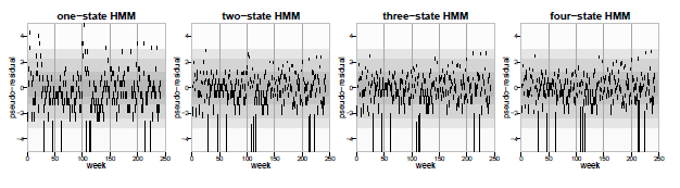 Agora, tendo delineado a teoria básica dos pseudo-resíduos, podemos considerar o uso de pseudo-resíduos no contexto dos HMMs. A análise dos pseudo-resíduos de um HMM serve para dois propósitos, a saber, a avaliação do ajuste geral de um modelo selecionado e a detecço de observações aberrantes. Dependendo dos aspectos do modelo a ser analisado é possível distinguir entre duas abordagens de computação de pseudo-resíduos de um HMM.