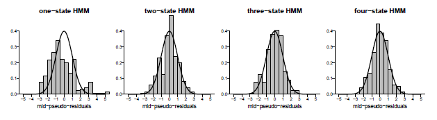 Quando se trata de HMMs, a análise de resíduos torna-se um pouco mais complicada devido ao fato de que os resíduos não estão sequer aproximadamente distribuídos de forma independente e idêntica. Normalmente, cada um dos estados do HMM emite observações a partir de uma distribuição diferente. Assim, distribuições diferentes também devem ser ajustadas aos resíduos de acordo com os diferentes estados do HMM. A dificuldade reside no fato de que, em geral, a Cadeia de Markov subjacente é desconhecida e, portanto, os resíduos não podem ser ordenados de forma adequada. Uma solução para este problema é o uso dos chamados pseudo-resíduos, que iremos introduzir a seguir.