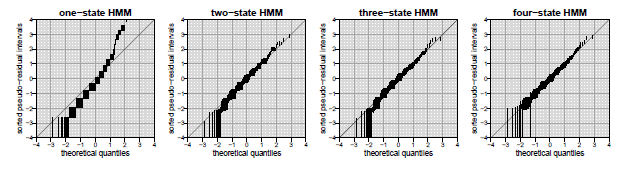 Na seção anterior, consideramos dois critérios para a seleção de modelos nos HMMs. Esses critérios fornecem uma regra de decisão para selecionar o melhor de vários modelos ajustados, no entanto, eles não garantem que o modelo selecionado seja realmente apropriado. Portanto, ainda é preciso avaliar o ajuste do modelo escolhido.