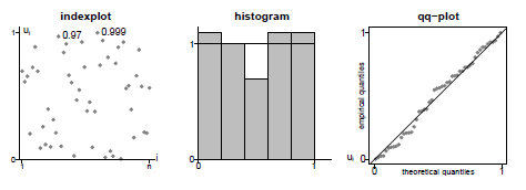 Se o histograma e o gráfico qq-plot dos pseudo-resíduos uniformes \(u_i\) não parecerem como deveriam, pode-se deduzir que os resíduos não são distribuídos uniformemente e, portanto, o modelo não é válido. Certamente, o conceito de pseudo-resíduos uniformes é muito útil, no entanto, pode levar a problemas na identificação externa. Por exemplo, considere o gráfico de índice fornecido na Figura V.6 e observe os valores próximos a 0 ou 1. É difícil ver se um valor é muito improvável ou não. Como um valor de 0.999 é difícil de distinguir de um valor de 0.97, o gráfico de índice é quase inútil para uma análise visual rápida.