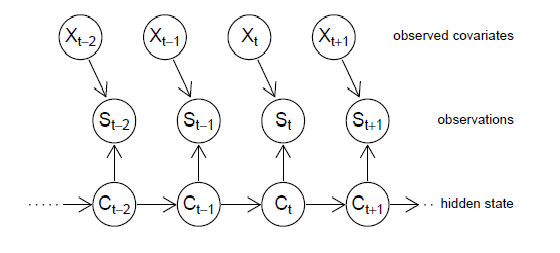Os HMMs também podem ser modificados para permitir a influência dos covariáveis postulando a dependência das probabilidades \(p_{ti}(s_t)\) dependentes do estado sobre esses covariáveis, como demonstrado na Figura VI.2. Isto abre o caminho para que tais modelos incorporem a tendência temporal e a sazonalidade, por exemplo. Na verdade, já permitimos que as probabilidades dependentes do estado mudassem ao longo do tempo na seção anterior.