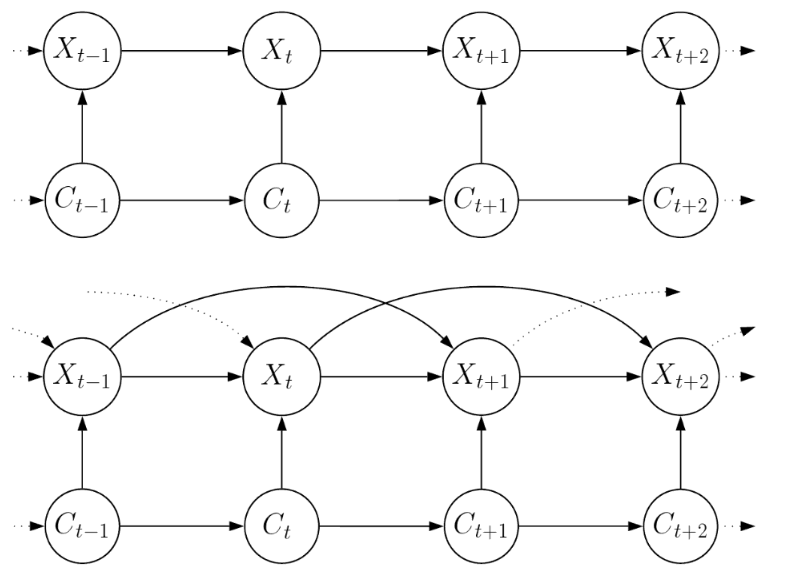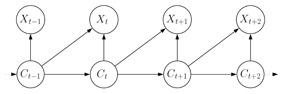No modelo básico não há bordas conectando diretamente as observações anteriores ao \(S_t\), a única dependência entre as observações surge do processo latente \(\{C_t\}\). No entanto, pode haver aplicações em que se suspeite de dependências extras ao nível da observação e que devem ser permitidas no modelo.