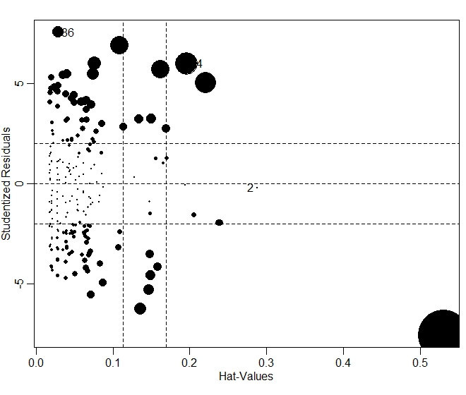 Este comando produz um gráfico de bolhas, mostrado na figura acima, que combina a exibição de resíduos estudentizados, valores de \(h_i\) e distâncias de Cook, com as áreas dos círculos proporcionais à distância de Cook.